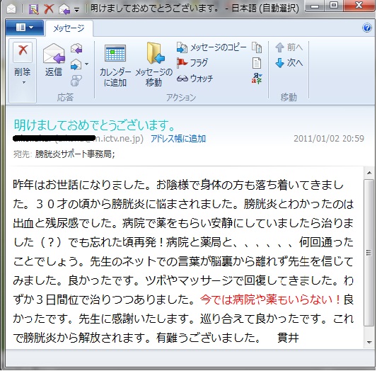 その後あっという間に治療し、2度と膀胱炎に悩まされることが無いように